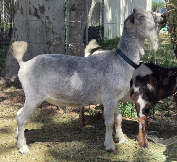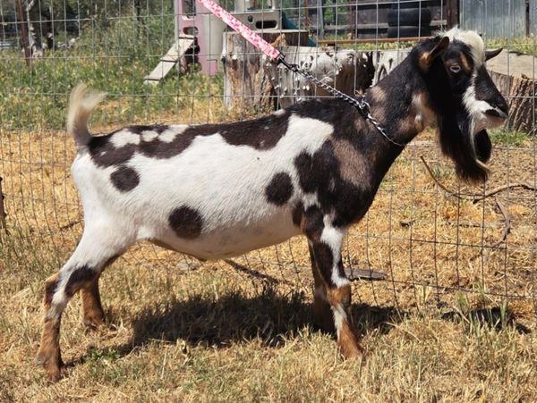 Everest was born March 13, 2024. DNA is on file with ADGA. He is a beautiful silver buck with wattles and blue eyes. Check out this guy's pedigree.